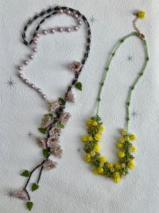 — ブログ, レッスン可能作品 — 梅村先生作品2点 新川先生作品1点 レッスン出来ます 2026年1月8日 レッスンでお作りいただけるキットをご紹介します。お急ぎの方は、LINE、メールにてご連絡お願い致します。 価格はこちらに掲載した時のお値段のため、変動することがございますのでご了承ください。 梅村里美先生デザイン 左 SAKURA 5500円(税込) 右 ミモザのネックレス 4400円(税込) 新川智未先生デザイン グレイシア 3960円